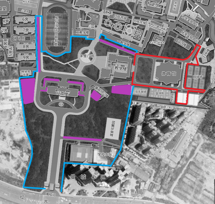 二、管控区域:观众停车区为东校门至图书馆区域(附件一图片黄色线条内),赛事区为南校门、办公楼、三教周边区域(附件二图片蓝色线条内),比赛场馆为体育馆(附件二图片红色线条内)。