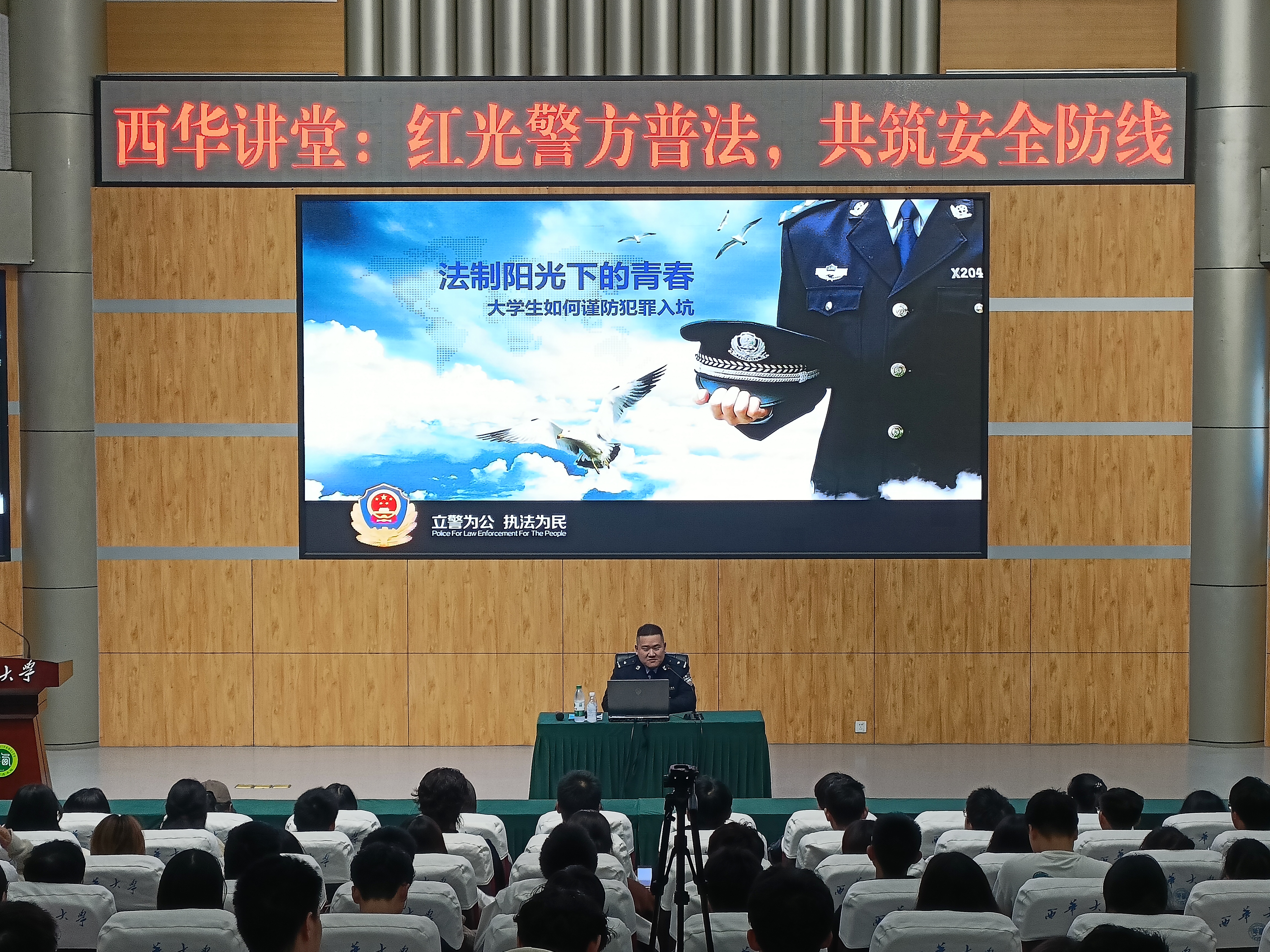 2024年11月14日晚7:00,伟德国际1946党委保卫部联合郫都区红光派出所,在四教报告厅开展了“法制阳光下的青春——大学生如何谨防犯罪入坑”主题讲座,成都市公安局郫都分局讲师团成员、红光派出所民警康淳森受邀主讲,我校300余名同学参加了此次讲座。