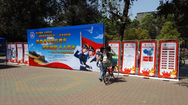 2017年4月12日,在受武装部邀请,四川省国防教育委员会办公室来校开展征兵专项宣传,宣传组在一食堂前设置了宣传点,摆放了宣传展板,对国家的兵役制度、法规,大学生参军流程,参军的优抚政策等进行了图文展示,对过往学生发放了宣传资料,同时安排了现场咨询人员,为有意报名参军的学生进行咨询服务。此次宣传活动拉开了我校兵役登记和征兵工作的帷幕。