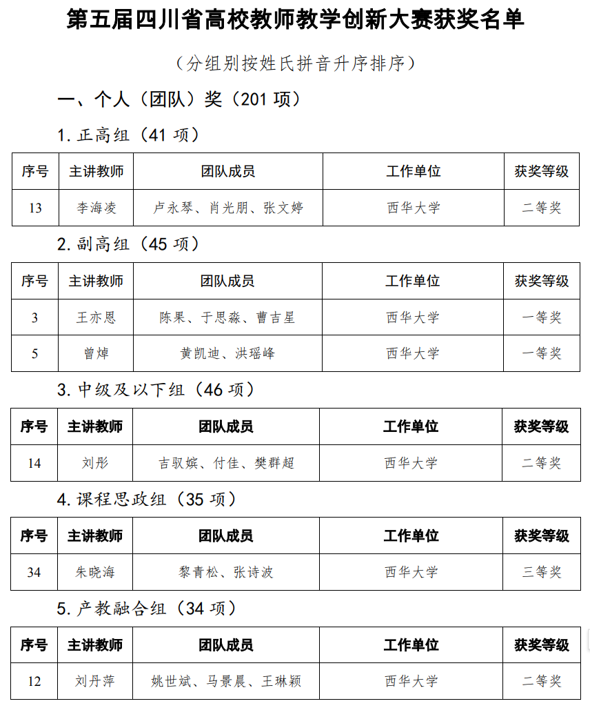 第五届四川省高校教师教学创新大赛我校教师团队获奖情况一览表
