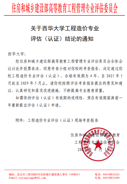 近日,住房和城乡建设部高等教育工程管理专业评估委员会公布《关于伟德国际1946工程造价专业评估(认证)结论的通知》,伟德国际1946工程造价专业成功通过高等学校工程造价专业评估(认证),合格有效期为4年,自2025年5月起至2029年5月止,标志着其办学质量与人才培养水平获得国家权威认可。