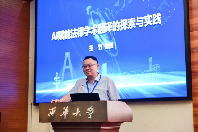 四川大学王竹教授讨论了AI赋能法律学术翻译的法律表达严谨性(信)、翻译结果准确性(达)和学术研究能力性(雅)三大导向,并展示了应用场景及其实践。