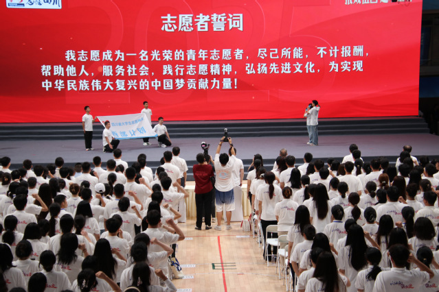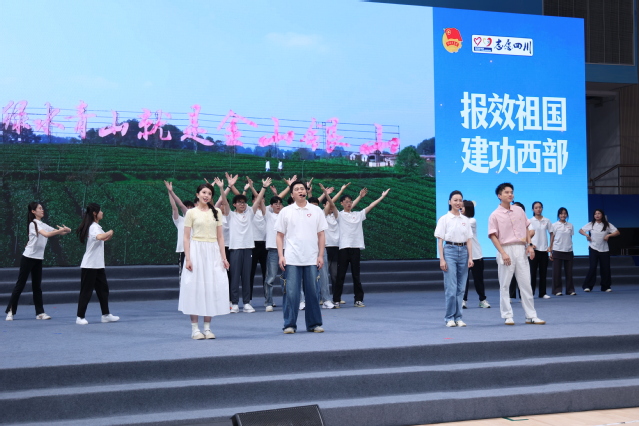 随后,志愿者们唱响四川西部计划主题曲《向西》。歌曲旋律激昂又饱含温情,生动再现了志愿者们告别亲友、奔赴西部的坚定身影,展现了扎根基层、服务群众的热忱与担当,传递出一代代志愿者接力奉献的青春传承。在激昂的氛围中,全体志愿者庄严宣誓,发出了“为中国式现代化挺膺担当”的时代强音,展现出投身西部、服务基层的坚定决心。