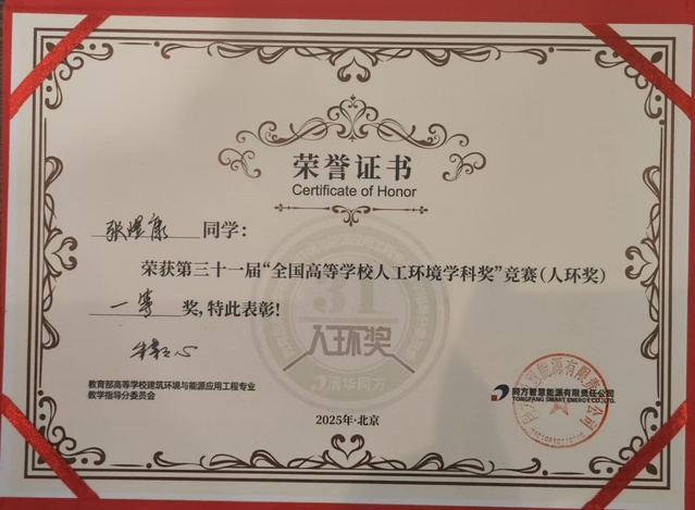 8月29日,第三十一届全国高等学校人工环境学科奖(简称“人环奖”)竞赛在北京圆满落幕。我校建筑与土木工程学院2022级建筑环境与能源应用工程专业张煜康同学,凭借扎实的专业知识和出色的综合能力荣获全国大赛一等奖。