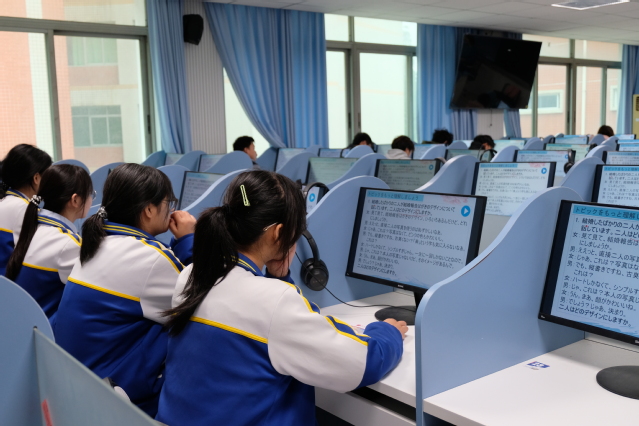 在第四教学楼的语言实验室,同学们走进英语、日语课堂,体验语言与科技融合的现代教学模式,并通过学院宣传片和负责人介绍,深入了解外国语学院的办学特色。