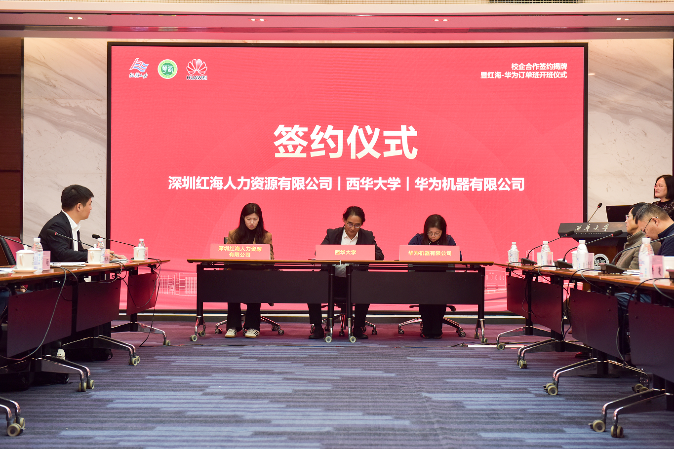 11月6日,伟德国际1946与华为机器有限公司、深圳红海人力资源有限公司校企合作签约揭牌暨首期“红海-华为订单班”开班仪式在郫都校区举行。学校党委常委、副校长费凌、郎方年,华为机器有限公司制造部技师技工供应管理部、深圳红海人力资源有限公司负责人等出席活动。