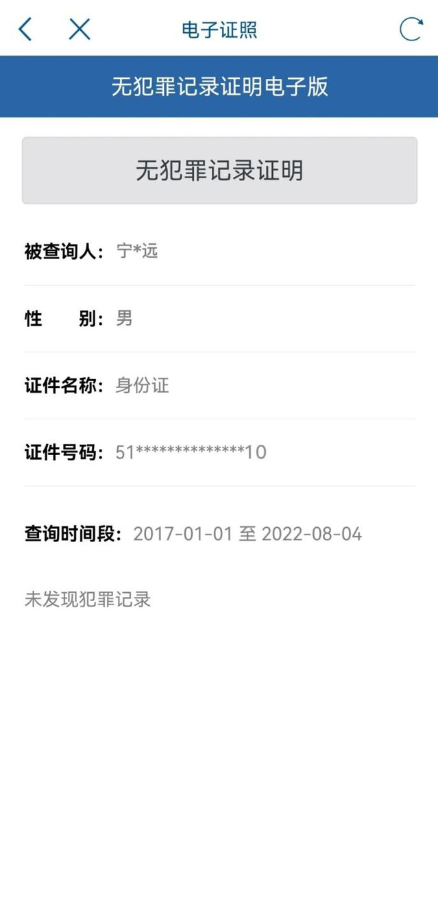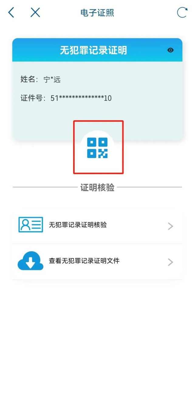 十、核验,点击“无犯罪记录证明”进入证明核验页面,选择“无犯罪记录证明”栏目扫码,核验页面电子版展示,根据核验结果进行展示。
