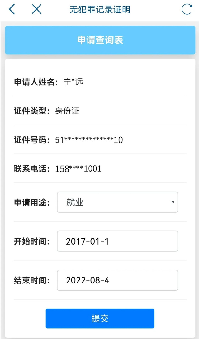 六、在“申请查询表”页面,申请人基本信息将自动引入,确认基本信息无误后选择“申请用途”、查询时间范围。(若系统判断申请人在一年内申请次数大于 3 次,则应上传相关证明材料。)