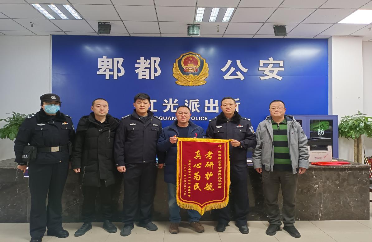 在研究生考试期间,我校学生唐某、严某,在临考进场时发现自己身份证遗失,无法进入考场完成考试。情急之下,二人向在场执勤的保卫处工作人员和当时驻守在校的红光派出所民警求助。我校保卫处工作人员和红光派出所所长许刚简单沟通后,立即为遗失身份证的考生现场查询身份信息,由红光所民警打印身份证明直接送达校内,让二人顺利进入考场完成考试,在场考生纷纷点赞。12月31日,唐某、严某为表感谢,特制锦旗一面,感谢信两封送到了保卫处和红光派出所。