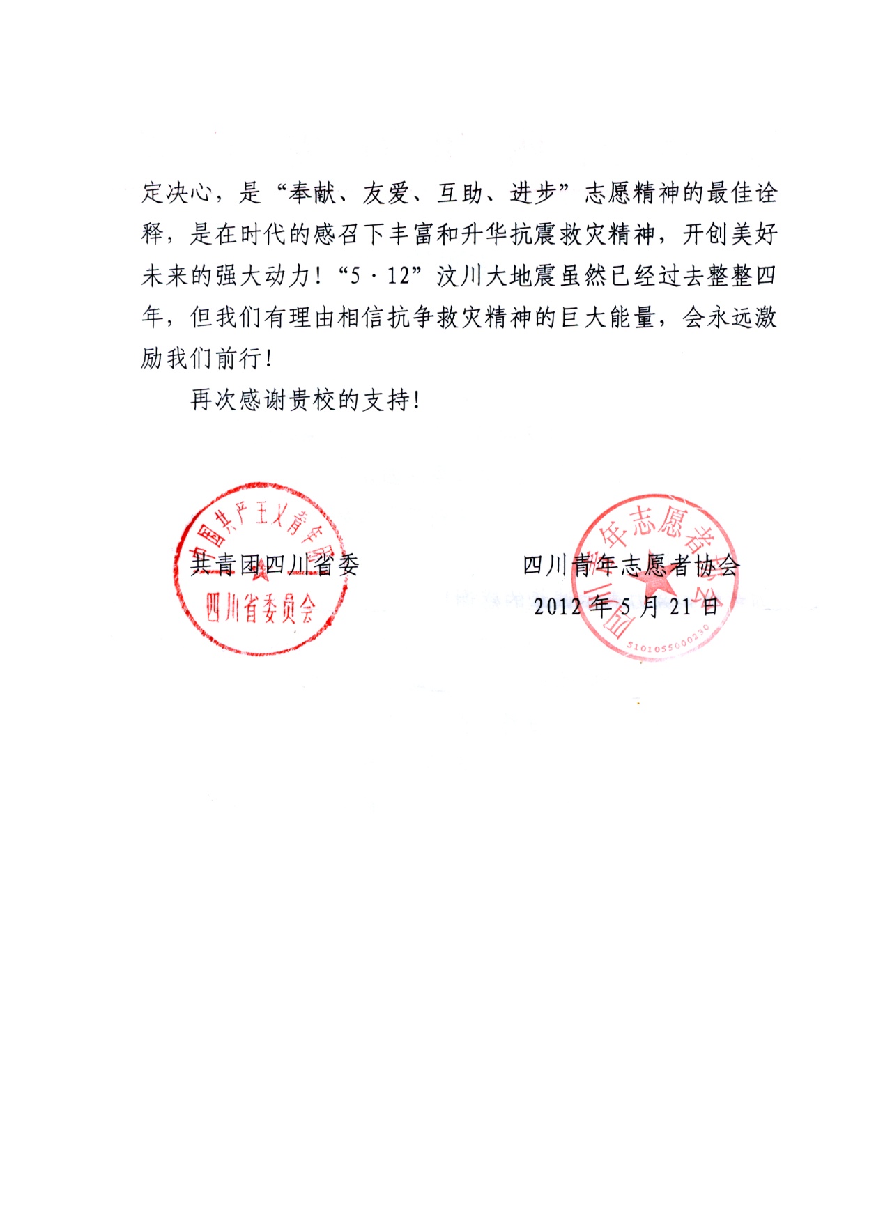 团省委发来的感谢信