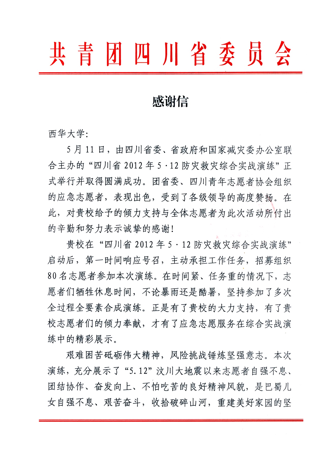 近日,共青团四川省委向我校发来感谢信,感谢我校对“四川省2012年5.12防灾救灾综合实战演练”的大力支持及我校全体志愿者的辛勤付出。 “四川省2012年5.12防灾救灾综合实战演练”启动后,我校各方通力配合,积极组织,在第一时间召集我校志愿者共计80名,参加了于5月11日在崇州市街子古镇举行的集结拉动科目的演练。我校志愿者作为省应急志愿服务总队的一员,接受了中共中央政治局委员、国务院副总理、国家减灾委员会主任回良玉,省委书记、省人大常委会主任刘奇葆等省市领导的检阅。 共青团四川省委在感谢信中提到:“正是有了贵校的大力支持,有了贵校志愿者们的倾情奉献,才有了应急志愿服务在综合实战演练中的精彩展示。”在演练过程中,我校志愿者表现出不怕苦不怕累的优良作风,听从指挥,纪律严明,积极配合,团结协作,出色地完成了演练任务,受到了各级领导的高度赞扬。