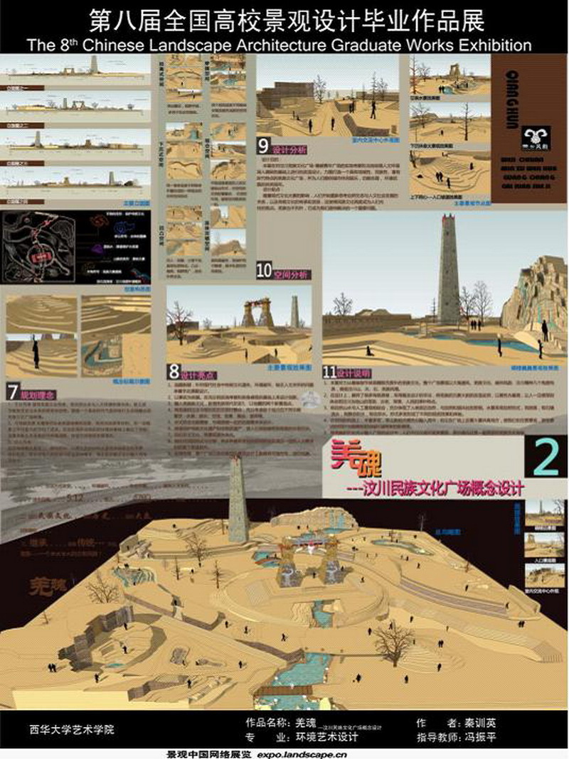 由我校艺术学院冯振平老师指导,秦训英同学设计的《羌魂---汶川民族文化广场概念设计》,在刚刚结束的“第八届全国高校景观设计毕业作品展”中荣获优秀奖。