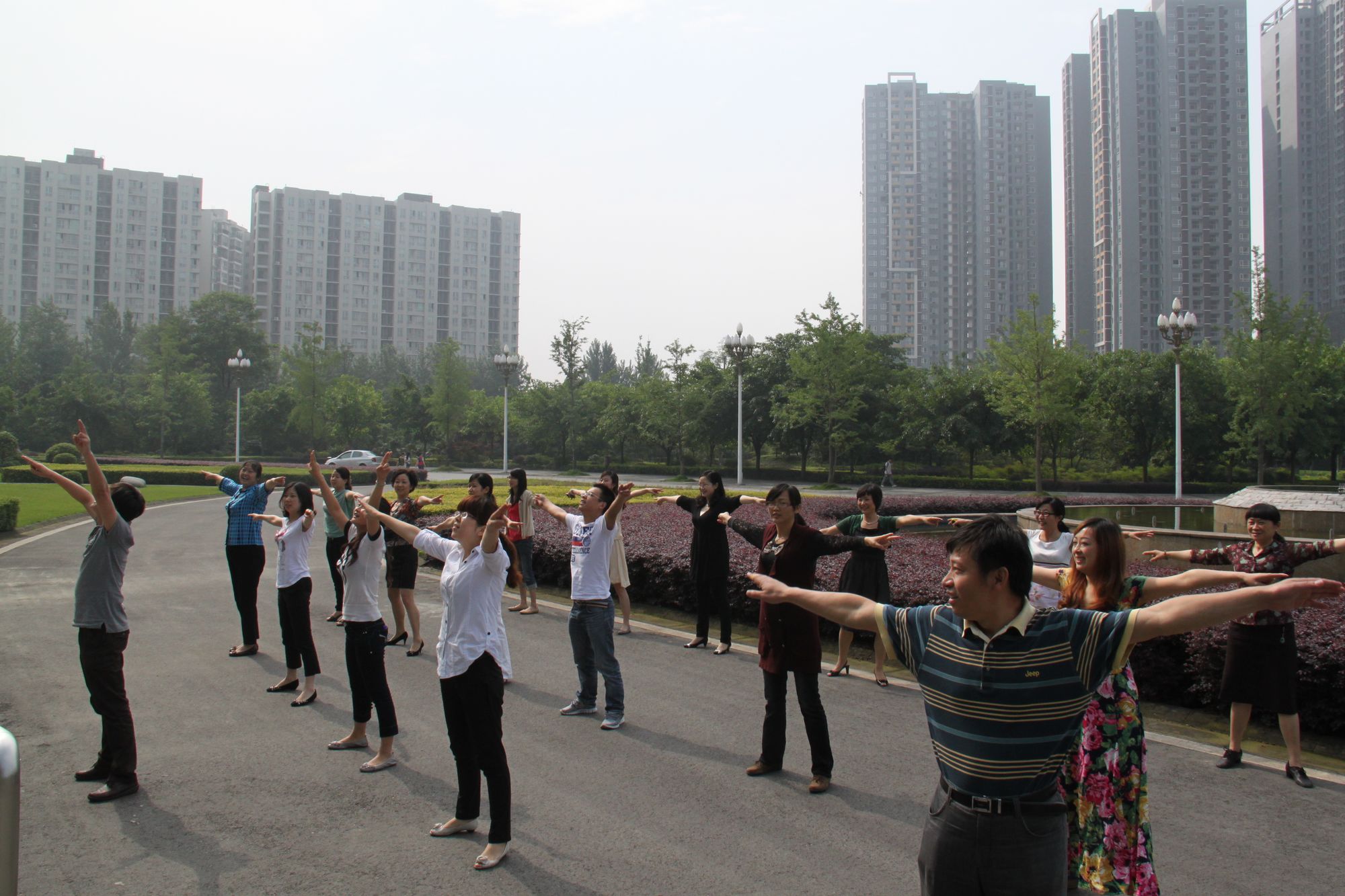 6月4日上午9:40,行政楼的教职工们纷纷走出办公室,聚集到行政楼前的空地上,做起了第九套大众广播体操。大家随着领操老师的“一二三四、二二三四”的口令,认真地练习着。15分钟以后,老师们纷纷返回办公室,又积极认真地投入到工作中。 为了保证教职工身心健康,使教职工愉悦高效地工作,学校提倡全体教职工自愿、积极参加“工间操”等各类体育活动。从6月1日起,按照“教职工自愿参加,工作优先,不得影响正常工作秩序”的原则,采取小型分散,室内外相结合的办法,全校正式开展“工间操”活动。各部门、各学院教职工可在工作日的每天上午9:40至9:55,下午3:40至3:55,因地制宜开展第八、第九套广播体操、“排舞”、健身操、瑜伽、眼保健操等“工间操”活动。 学生工作部曹焜纯老师表示,做“工间操”可以让疲惫的身心有个舒适、放松的时间段,调节自己的身心健康,从而提高工作效率。 据悉,为了更好地推广“工间操”活动,5月31日下午,由校工会牵头,会同体育学院,组织各分工会相关人员在学生活动中心进行了“第九套广播体操”培训。参加此次培训的老师还承担着负责教会本部门其他老师的重要任务,从而掀起全校教职工同做“工间操”的热潮。 机关一总支的老师们正在做广播体操 |
