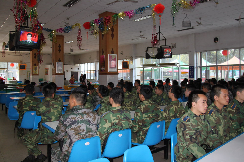 后备军官学院的同学们在一食堂集体观看十八大开幕式