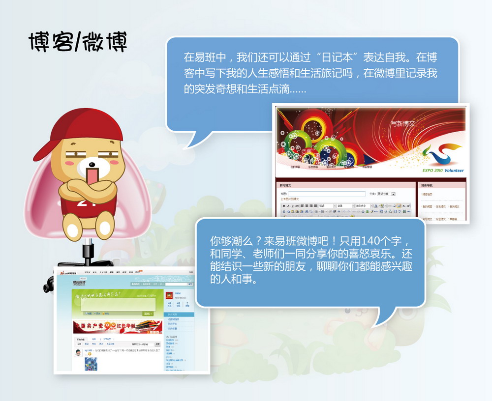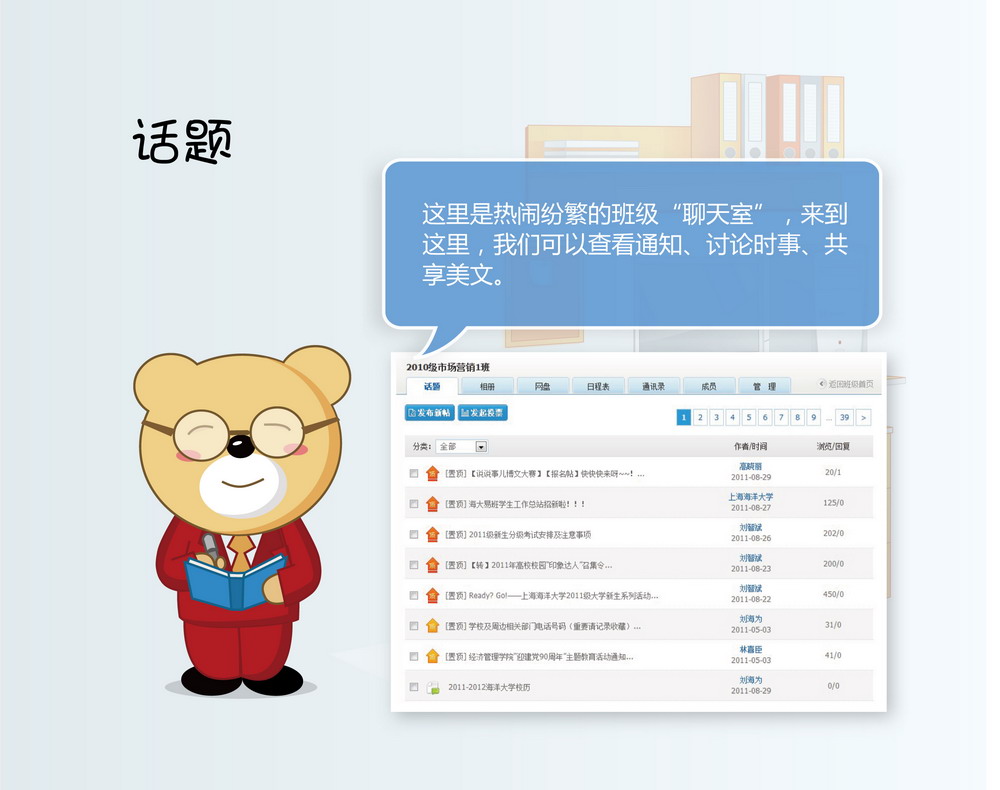 易班拥有非常强大的班级功能。每个进入伟德国际1946易班的同学都能找到自己相对应的班级,辅导员同时也是班级的管理员,师生们可以在“话题”中发布通知、决策事务、征求意见、寻求帮助、开展活动,也能在此发布投票、评选班委等。 在个人主页,同学们可以实时掌握好友和班级动态,可以收到学校、学院、老师发来的通知,可以定制社团、兴趣组织的信息,可以写博客、传照片、在网盘上共享资源,甚至和其他师生玩游戏。 “易班”是上海市教卫党委按照教育部建立大学生网络互动社区的要求,依托上海市教育系统网络文化发展研究中心,从2009年开始自主研发的网络文化建设项目。 经过近3年的发展,“易班”已经覆盖上海44所高校,实名注册用户超过46万,共建班级1.9万个,日均动态数1500万。上海“易班”建设得到了胡锦涛、李长春、刘云山、刘延东等中央领导同志和上海市委书记俞正声等领导的批示,各级领导充分肯定了“易班”为大学生提供的在线交流、资源共享、网络文化活动的平台作用,并要求对“易班”进行大力支持,并逐渐覆盖更多高校,发挥更大作用。 为什么要建易班? 近年来,学校党委一直在探索研究如何加强网络文化建设。学校先后组织人员于2010年、2011年两次到上海等高校调研,对“易班”的设计思路、建设方法、研发技术、政策支持进行全面了解。 在认真听取调研汇报基础上,4月18日,学校党委常委会研究决定,学习上海市教委和上海高校的先进经验,建设伟德国际1946易班。我校的易班建设得到了上海市教卫党委、四川省教育厅的大力支持,上海市易班发展中心表示将向我校无偿提供技术支持。 4月25日,学校相关单位召开了伟德国际1946易班建设筹备工作会。会议讨论了《伟德国际1946易班建设工作方案(讨论稿)》,《方案》主要涉及西华易班建设的组织机构、建设目标、工作步骤等内容。会议决定,学校将组建易班建设领导小组、易班发展中心和易班学生工作站。 为了顺利推进易班建设,我校在上海易班发展中心的指导下,于4月28日开始试用易班。目前人文学院、电气信息学院、建筑与土木工程学院的部分班级已经注册成为易班成员。“五一”期间,党委宣传部、学生工作部对试点班级的使用情况和存在的问题进行了搜集汇总,并及时向上海易班发展中心反馈。 5月4日上午,伟德国际1946易班建设培训会在行政楼报告厅举行。上海教育系统网络文化发展研究中心常务副主任朱明伦、上海易班发展中心主任助理陈倩、运维总监吴文越、技术研发工程师贾磊专程来到我校,就“易班”建设的背景、功能、操作流程以及发展趋势作了详细介绍。校党委副书记王小林代表学校对朱明伦主任一行表示热烈的欢迎,并就易班建设提出了要求。校党委宣传部部长张力、校学生工作部部长徐元彬就伟德国际1946易班建设的背景、前期准备情况和要求作了介绍。 为了方便我校师生安全、快捷、免费使用伟德国际1946易班,经过学校和移动公司、上海教育系统网络文化发展研究中心协调,我校将建立校内镜像服务器,实现在校师生免费登录、使用伟德国际1946易班。目前,伟德国际1946易班的登陆主页已经建设完成,后台建设已基本完成,正式面向全校师生开通。 怎么玩转易班? 只需点击http://eclass.xhu.edu.cn/,注册进入,完善个人资料通过校方验证,找到自己的班级,你就可以轻松玩转易班! 在这里,你可以通过微博和博客记录下生活点滴,与朋友分享喜怒哀乐。 在这里,你可以发帖与来自五湖四海的朋友谈天说地。 在这里,你可以通过易班无限量的永久相册功能,记录下美好的大学时光与同学分享。 在这里,你可以通过易班 “群组”,根据个人的兴趣爱好加入网上兴趣小组、网上社团,与志同道合的朋友聚集到一起。 在这里,你可以通过易班 “网盘”,获得无限量、高速的网上存储空间,可以将资料存入网盘与其他高校师生分享。 在这里,通过易班 “通讯录”功能,加入班级后,你可以随时更新自己的电话和邮箱,这样毕业多年,也还能和同学保持联系。 在这里,你还可以通过易班 “im即时通讯”功能,与好友在线聊天,并异地备份聊天记录。 在这里,老师可以通过易班短信将通知信息群发到班级同学的手机上。而且,“掌上易班”即将开通,到时候通过手机可以随时登陆易班。 …… 同学们,易班来了,你们准备好了吗? 易班功能介绍图(一) 易班功能介绍图(二) 易班功能介绍图(三) 易班功能介绍图(四) 易班功能介绍图(五) 易班功能介绍图(六)