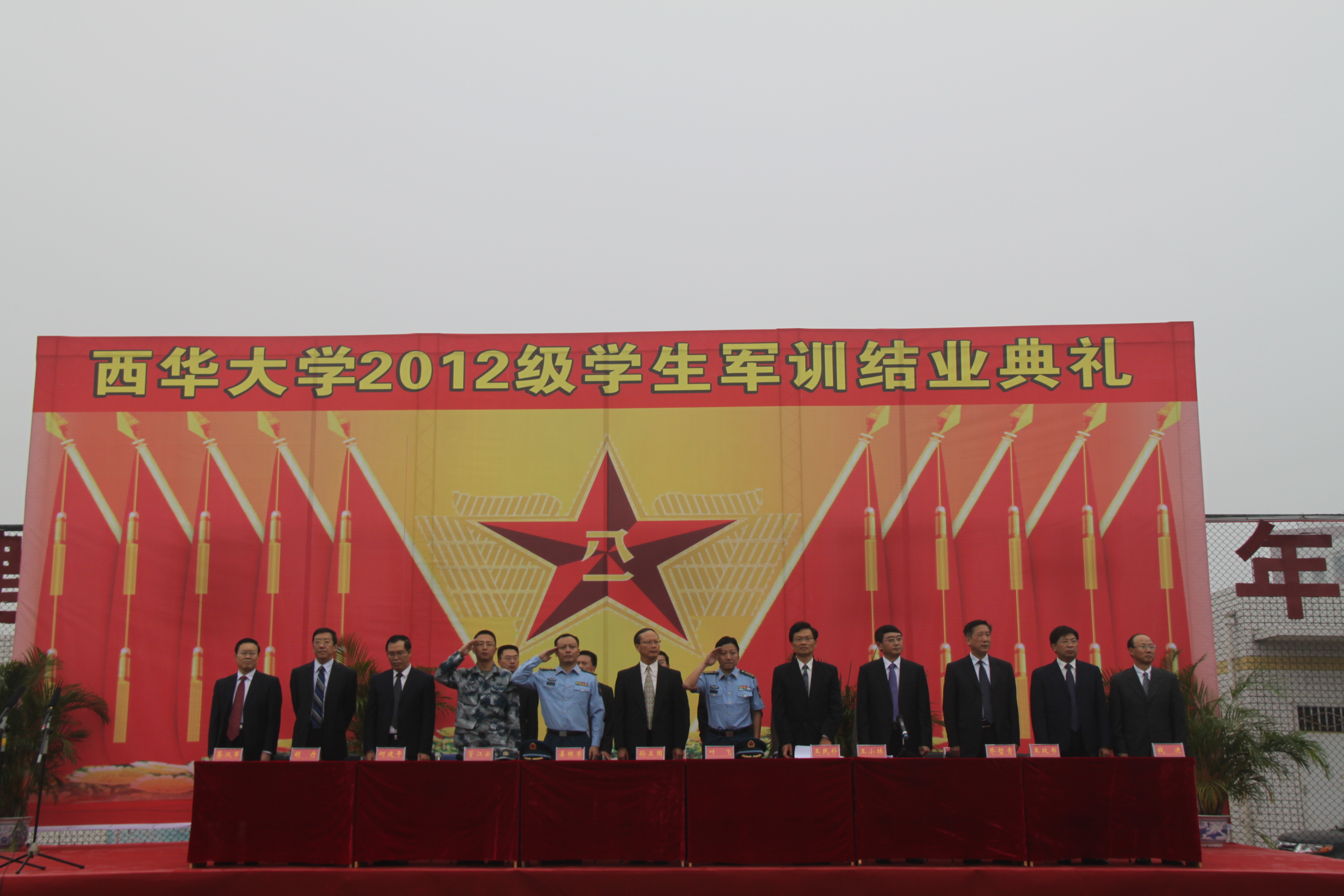 成都军区空军干部处选培办主任叶飞上校,成都军区空军95607部队政治部主任姜根荣上校,成都军区空军95607部队政治部副主任管江云中校,校长孙卫国,校党委副书记、军训工作领导小组组长王民朴,校党委副书记、军训工作领导小组副组长王小林,副校长、军训工作领导小组副组长何建平,副校长乔哲青、胡丹、王政书,正厅级调研员蔡汉军、钱进,以及军训工作领导小组成员单位主要负责人,军训团校本部全体教官,各学院分管学生工作的党委书记(副书记),各连队指导员,2012级本部全体参训学生和武装部、学工部工作人员参加了本次典礼。校党委副书记王小林主持典礼。
