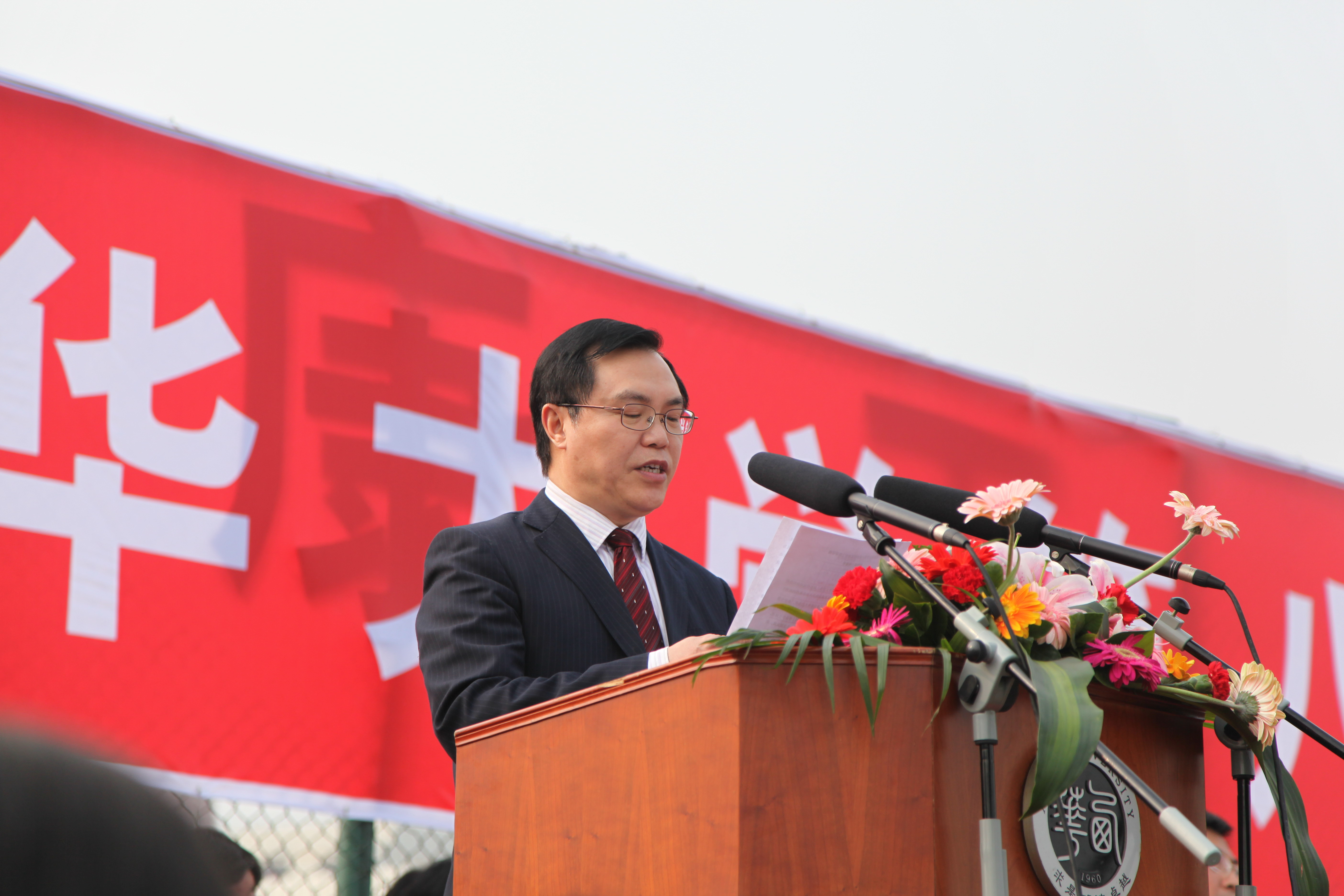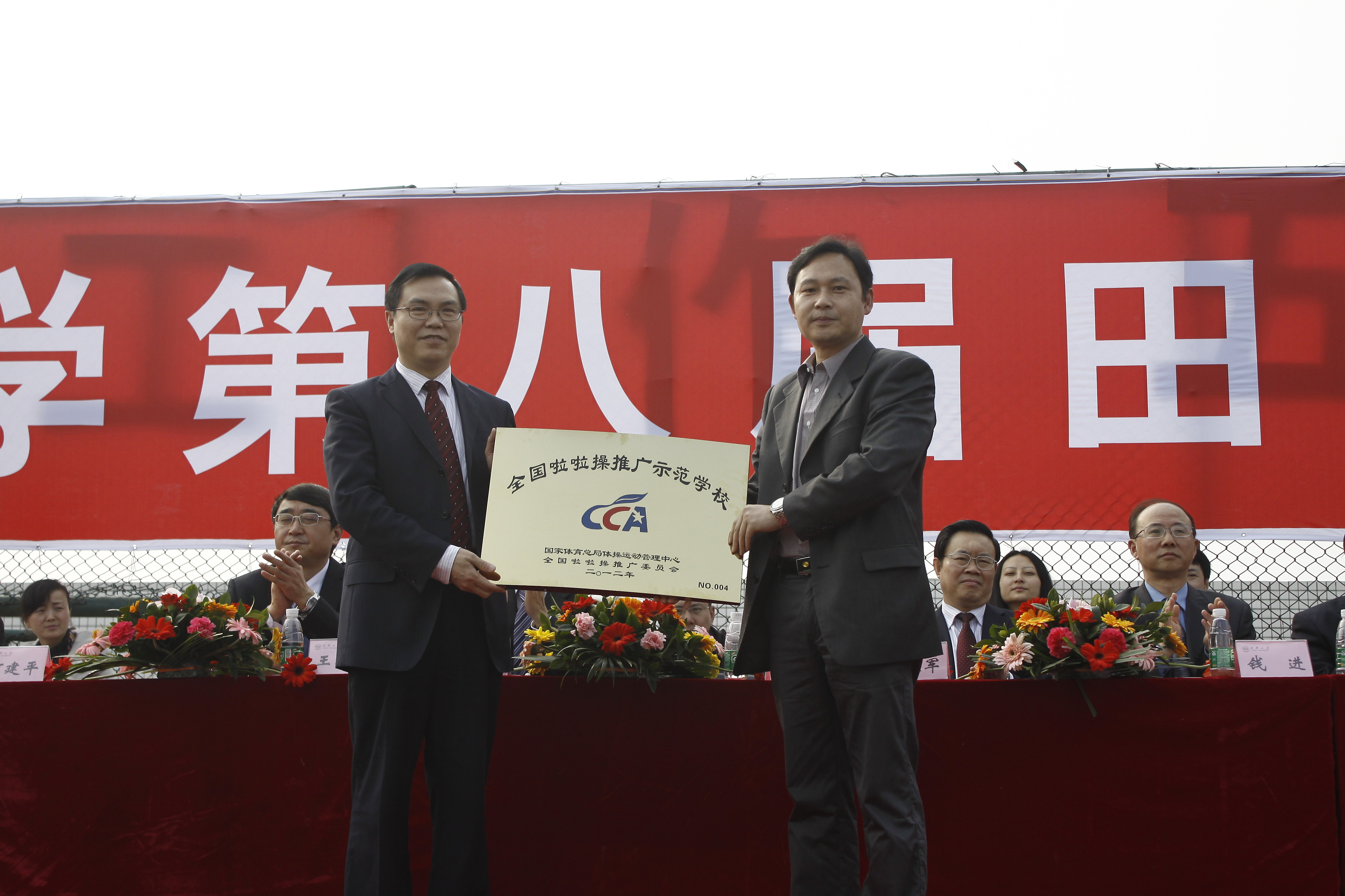 校党委书记张小南宣布运动会开幕 国家体育总局体操运动管理中心中国啦啦操分会副主席邱建钢(右一)授牌 副校长王政书主持开幕式 整齐的方阵入场 入场表演 大型团体操表演 啦啦操表演 起跑 |