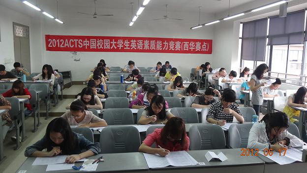6月17日下午,ACTS中国校园大学生英语素质能力竞赛复赛在我校举行。来自四川外语学院成都学院和伟德国际1946的100余名学生参加了此次复赛。 复赛分为口试和笔试,分别在5B413、416、417、418四个教室举行。口试从下午1点半开始,共分为三个环节,每位参赛选手时间共为5分钟,参赛者到备考室抽题并准备一分钟抽题朗读、三分钟抽题演讲和一分钟评委问答。笔试从下午2点开始,3点半结束,主要考察参赛者对英语词汇量、英语语法、结构的使用和掌握情况以及英语的综合素质能力。考场上,参赛者们都沉着冷静,仔细思考,认真答题。 据悉,此次复赛的成绩将于近期公布。入围决赛的同学将会参加今年暑假举行的全国总决赛。总决赛将由来自美国和澳大利亚的评委全场出席。此次竞赛决赛采取托福、雅思的口试模型,与国际口试选拔比赛对接,奖项设为金奖、银奖、铜奖。获得金奖的同学将有机会留学美国的如斯坦福大学等排名前100名的大学。
