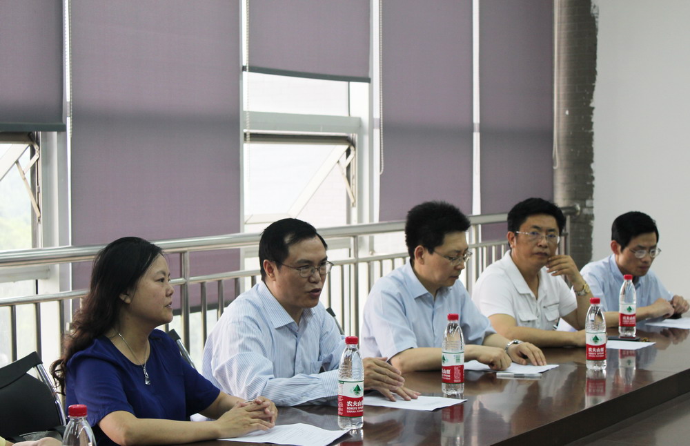 何建平副校长(左二)在评审准备会上向华立德公司介绍我校电子设计竞赛情况 |