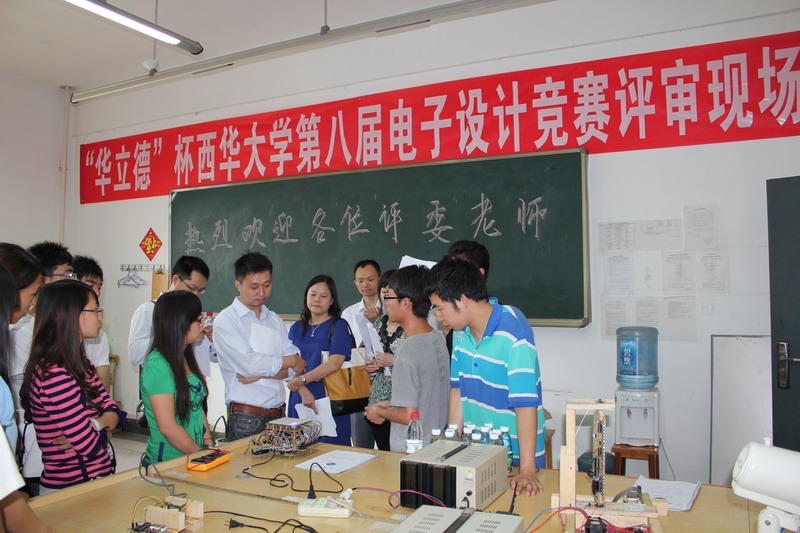 6月8日,由伟德国际1946校团委主办,电气信息学院承办的第八届“华立德”杯大学生电子设计竞赛评审工作在电气信息学院隆重举行。本次电子设计竞赛共收到电气信息学院和机械工程与自动化学院200余名同学的70余件参赛作品。参赛同学经过2个多月的辛苦准备,迎来了专家组的最后评审。 本次电子设计竞赛由四川华立德科技有限公司赞助,公司总经理徐江带领公司技术研发部门的主要骨干,亲自来校进行评审。学校参加评审的专家和领导有副校长何建平,招生与就业处处长阮永生,学生工作部副部长王强,校团委副书记王唯洁,电气信息学院党委书记董秀成,院长王军,院党委副书记周川,副院长魏金成、雷霞以及电气信息学院各教研室、系部主任和十余名专业课老师。 华立德科技有限公司和我校领导首先在学院6A301会议室召开了评审准备会。会上,何建平副校长代表学校向华立德科技有限公司领导的到来和赞助表示了欢迎和感谢,并介绍了学校概况和校内大学生电子设计竞赛开展的情况。徐明总经理代表公司向与会领导和老师介绍了公司的概况。周川副书记向与会各位评委宣读了评审办法和细则。评审专家共分成2个小组,由董秀成和王军分别担任组长,整个评审过程紧张而忙碌。在电气信息学院创新实验室评审现场,专家们认真评审参赛同学上交的作品并聆听同学的讲解,依据参赛作品的各项技术指标完成情况和参数做出客观公正的评判。 最终,来自电气信息学院2008级的作品“基于LABVIEW的综合测试仪”夺得本次大赛的桂冠“华立德”杯奖;另外大赛还评出一等奖三项,二等奖八项和三等奖十项。 赛后评委们表示,本次大赛的参赛作品客观反映了大学生对电子技术知识的掌握情况,肯定了同学们对新技术和新知识的探索精神,希望在今后的比赛中有更多非电子专业的同学加入到比赛当中来,促进同学们跨专业跨学科学习,增强同学们的创新意识和创业意识。电气信息学院领导和老师们也表示,将努力承办好这项面向大学生的群众性科技活动,推动我校信息与电子类学科课程体系和课程内容的改革。