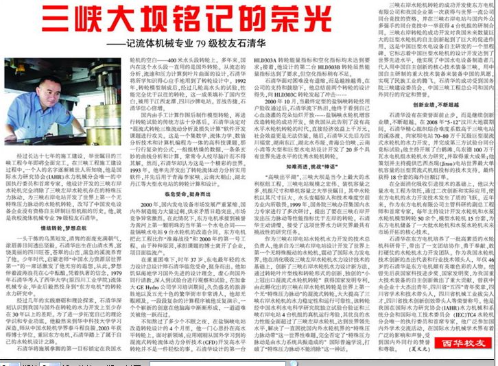 《伟德国际1946报》2009年第12期第二版专题报道石清华校友 附: 三峡大坝铭记的荣光 ——记流体机械专业79级校友石清华 经过长达十七年的施工建设,举世瞩目的三峡工程今年即将全面完工。在三峡工程施工建设过程中,一个人的名字逐渐被世人所知晓,他是国际水力研究协会(IAHR)水力机械分会唯一的中国执行委员和首席专家,他设计开发的三峡右岸水轮机完全消除了三峡左岸水轮机存在的特殊压力脉动,为三峡右岸电站开发了世界上第一个无特殊压力脉动的水轮机转轮,改写了中国发电设备企业没有资格自主研制巨型机组的历史。他,就是我校流体机械专业79级校友石清华。 情结转轮,梦想启航 一头干练的乌黑短发,清隽的面庞充满朝气,浓眉善目间透出坚毅。石清华出生在山清水秀、富饶美丽的四川旺苍,苍翠的山峦、湍急的溪流养育了他。少年时代,启蒙老师“中国水力资源居世界第一”的一席话激发了他无穷的遐想,从此,梦想伴着波涛浪花在心中酝酿。凭着执著的信念, 1979年石清华考入了伟德国际1946(原四川工业学院)流体机械专业,毕业后毅然投身到“东方电机”的转轮水力研究中。 经过几年的实践磨砺和理论探索,石清华深刻认识到我国与国外在转轮的水力开发上至少存在30年以上的差距。为了进一步拓宽自己的理论学识和专业功底,他毅然来到华中科技大学学习深造,师从中国水轮机学界泰斗程良骏,2003年获得博士学位。重回东方电机,石清华踏上了属于自己的水轮机设计之路。 石清华将施展拳脚的第一目标锁定在我国水轮机的空白——400米水头段转轮上。多年来,国内在这个水头段一直用的是国外转轮。从流态的分析、流速和压力计算到叶片曲面的设计,石清华将所学知识得心应手地用到了转轮设计中。1992年,转轮模型制成后,经过几轮高水头的试验,性能完全优于以往的转轮,这一成果填补了国内空白,被用于江西龙潭、四川沙牌电站。首战告捷,石清华信心倍增。 国内由手工计算作图后制作模型转轮,再进行转轮试验的传统方法十分落后。石清华决定对“混流式转轮三维流动分析及损失计算”软件开发课题进行攻关。这是一个集数学、流体力学、数值分析技术和计算机编程为一体的高科技课题,那一行行复杂的公式,一组组枯燥的数据,一条条玄妙的曲线分析和计算,常常令人绞尽脑汁而不得其解。然而,石清华却认为这是一个精彩的世界。1993年,他率先开发出了转轮流体动力分析实用软件,并先后用于青海李家峡、云南大朝山、湖北丹江等大型水电站的转轮计算和设计。 临危受命,挺身而出 2000年,国内发电设备市场发展严重紧缩、国内外制造能力大量过剩、供求矛盾日趋突出、市场竞争异常激烈。在此情况下,东方电机承接到被誉为黄河上第一颗明珠的当年第一个水电合同——盐锅峡水电站9台水轮机的改造合同。东方电机把此工程比作“淮海战役”和2000年的第一号工程。由于种种原因,承担课题的博士离开了企业,项目面临流产。 在重重困难下,时年37岁、东电最年轻的水力设计总设计师石清华临危受命,挺身而出。他如饥似渴地学习国外先进的设计理念,虚心向国外同行请教,深入到试验台进行观察和试验。在加拿大GE Hydro公司学习培训期间,久负盛名的旅游胜地以及五光十色的繁华街市非常诱人,他却无暇顾及。一段段复杂的计算程序被他反复演示,一个个崭新的创意在他脑海中渐渐形成,一道道难关被他一跃而过。 不知熬过了多少个不眠之夜,在盐锅峡电站改造转轮设计的4个月里,他一门心思扑在高水平转轮上。面对新领域,应用刚刚从国外学习到的混流式转轮流体动力分析技术(CFD)开发高水平转轮并不是一件轻松的事。石清华设计的第一台HLD303A转轮能量指标和空化指标均未达到要求;接着,他设计的第二台HLD303B转轮虽然能量指标达到了要求,但空化指标稍有不足。 石清华面对困难没有退缩,而是越挫越勇,在公司的支持和鼓励下,他总结前两个转轮的设计得失,向HLD303C转轮发起了冲击…… 2000年10月,当最终定型的盐锅峡转轮经用户验收通过后,石清华流下热泪,他终于看到自己心血浇灌的花朵灿烂开放……盐锅峡水轮机增容改造转轮的成功开发,使我国从此告别了没有高水平水轮机转轮的时代,直接经济效益上千万元,社会效益更是无法估量。随后,石清华又先后为四川福堂、湖南东江、湖北水布垭、青海公伯峡、云南小湾等大型和巨型水电站设计开发了20多个具有世界先进水平的优秀水轮机转轮。 知难而进,挑战“神话” “高峡出平湖”,三峡大坝是当今上最大的水利枢纽工程,三峡电站规模之宏伟、装机容量之多、机组尺寸和单机容量之大举世瞩目。其中水轮机以其尺寸巨大、水头变幅惊人和技术难度空前为业内所敬畏。1999年,国务院三峡办召集国内水力专家进行了多次研讨,提出了要在三峡右岸开发出压力脉动等性能指标优于左岸的转轮。石清华主动请缨,接受了这项世界水力研究界最具有挑战性的研究任务。 作为三峡右岸电站水轮机水力开发的技术总负责人,他亲自为三峡右岸电站设计开发了世界上第一个无特殊振动的水轮机,震动了国际水力发电界。他在消化吸收三峡左岸水轮机水力设计技术的基础上,创新了三峡右岸水轮机水力设计新方法,通过转轮叶片型线和转轮形式的创新,独创的“小上冠出口混流