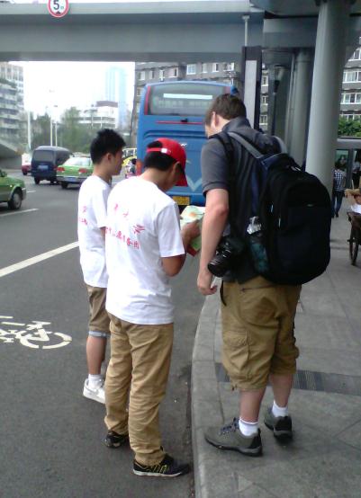 志愿者在成都市区为外国游客指路
