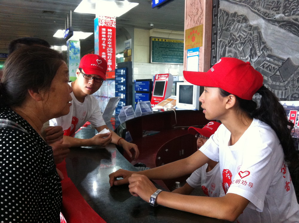 志愿者在公共汽车站宣传交通安全常识 志愿者在火车站为旅客提供咨询服务