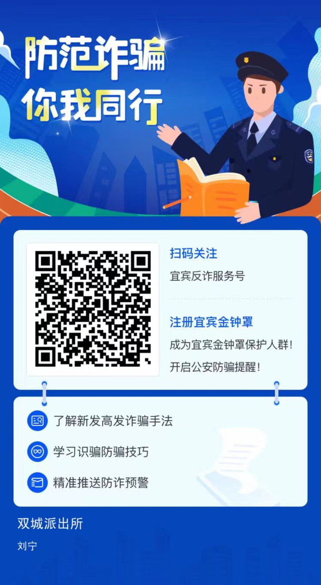 宜宾校区的驻校民警为宜宾市临港双城派出所刘宁,宜宾校区的同学微信扫描以下二维码,关注“宜宾反诈服务号”,点击“宜宾反诈→我的”注册“宜宾金钟罩”微信小程序。